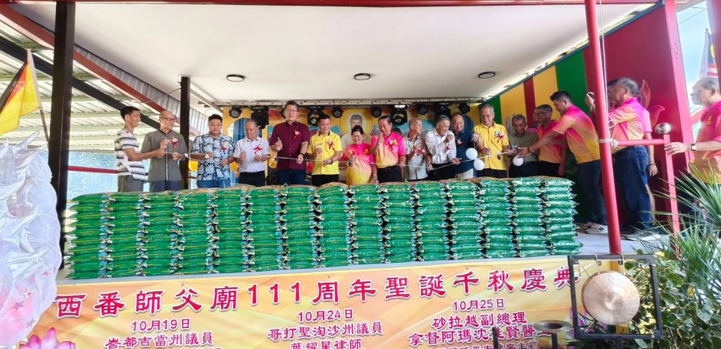 (古晋19日訊)古晋7哩甘榜哈芝峇基西番師父庙庆祝111週年圣诞千秋庆典,今日举行移交捐赠物资活动,来自土著及马来甘榜社区领袖踊跃出席,展现和谐氛围。
