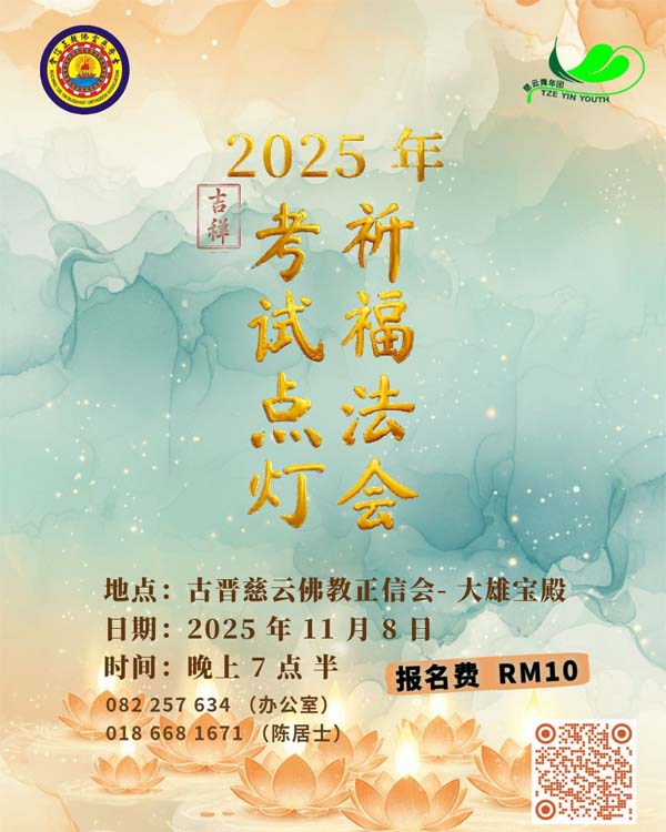 除此之外,释上净下悦法师也将于2025年11月8日(星期六)主持由本会属下青年团举办的《2025年考试点灯祈福法会》。