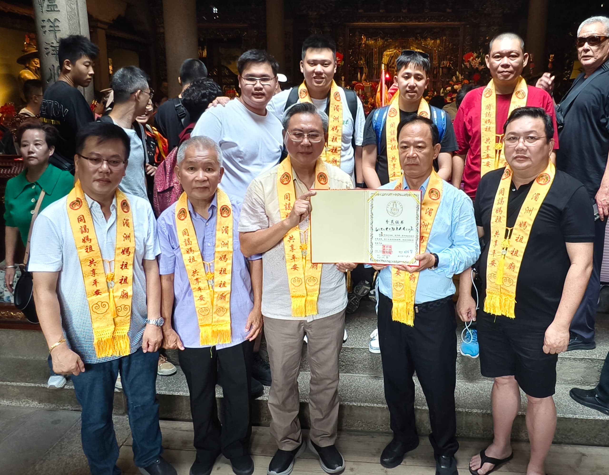 今日恭迎妈祖仪式,中国莆田市湄洲妈祖祖庙董事会董事长林金赞特地移交妈祖金身分灵证书给予张光福。