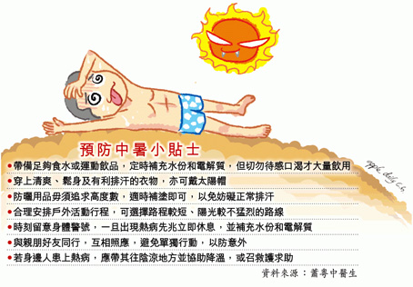另一方面,热天里游泳成为不少人的消暑选择,但原来在水中仍要注意预防热病。萧表示,热病的主要成因除环境高温外,亦包括身体脱水,因此浸在水中,虽然体温不会大幅提高,但在阳光照射下身体会如常排汗,如果未能及时补充水份和电解质,仍会增加患热病的风险。进行户外活动是患热病的高危场合,但留在室内时亦不能掉以轻心,若长期留在温度较高及空气不流通的室内环境,例如桑拿房及天台被暴晒的铁皮屋,也有机会中暑。