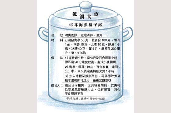 许称,该糖水加入又称“平民燕窝”的雪耳,有滋阴润肺、养胃及生津功效。港人冬天爱密密吃火锅、吃辛辣食物,加上有夜睡习惯,更容易受燥邪、热邪影响,出现热气症状,故秋冬特别适合吃雪耳、百合、南北杏等,减少受邪气影响而患病。雪耳食法很多,除了煲上述椰子露,也可以炮制雪耳百合水作养生茶,容易咳嗽、气管敏感、咽喉敏感人士,或烟酒过多人士适合,做法简单,材料包括两朵干雪耳、两両干百合,先将材料用慢火熬制一小时至完全融化,再加糖即可。此外,雪耳又可作家常煲汤,推介将雪耳、无花果、苹果、南北杏及瘦肉一起煲汤,可清肺化痰及防止咳嗽。木瓜南北杏炖雪耳则可润肠通便、滋润皮肤。