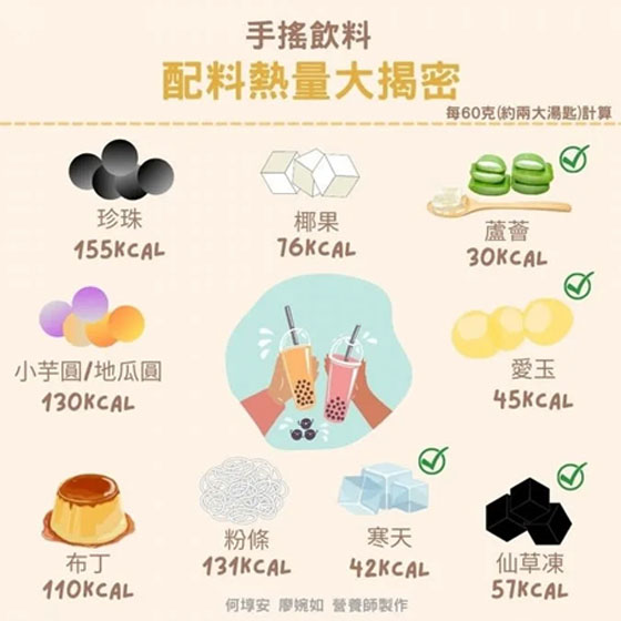 其中热量最低的是芦荟,仅有约30kcal,其次是寒天42kcal以及爱玉45kcal,热量最高的则是珍珠以及小芋圆;他也提醒爱喝饮料的民众,如果已习惯喝全糖,也可以渐进式的调整,逐步减低糖量,慢慢调整到无糖茶饮搭配配料。