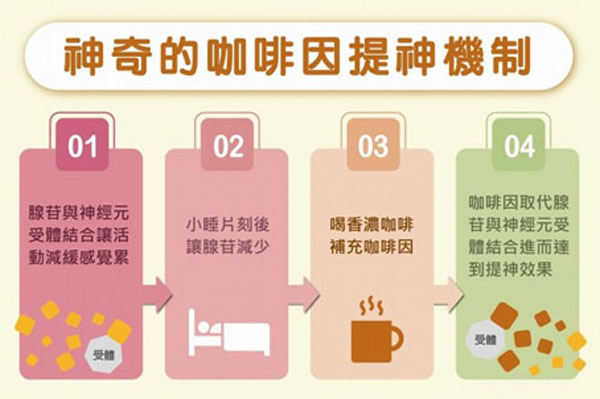 陈一心补充,若是身体已经感觉昏昏欲睡,那时再喝咖啡已经来不及了;因为当身体累积1天的疲劳后,才摄入咖啡因,“腺苷”捷足先登,把咖啡因阻挡在外,于是产生越喝越累的反效果。他也建议,不如开车前先“小睡一下”,让“腺苷”减少后再补充咖啡,才是最佳时机。