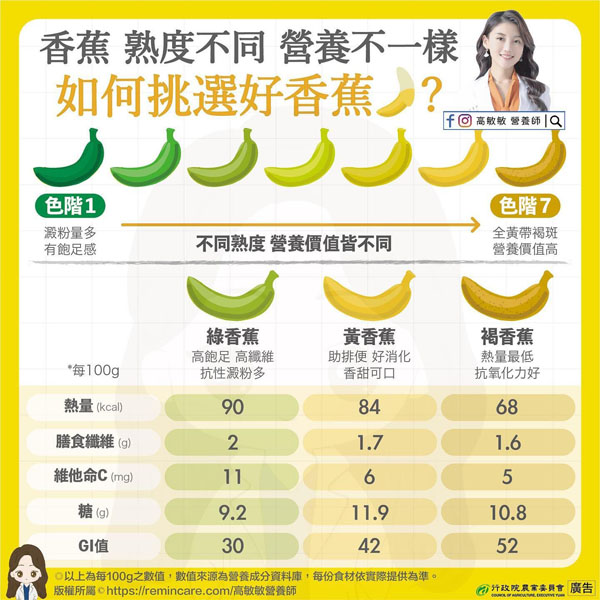 正妹营养师高敏敏在粉专指出,香蕉不同成熟度营养价值不同,可分为7个色阶,最绿的色揭1,淀粉量多、吃完会带有饱足感;而色阶7则呈现全黄并带有褐斑,这时候的香蕉是营养价值最高的。