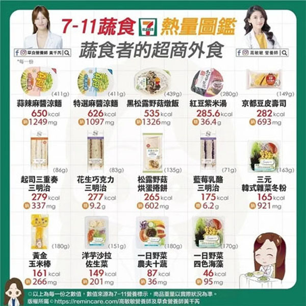 超商的食物选择很多,除了热食、零食,还有外食族必备的微波食品,其中蔬食也是不少人用餐的选择,但事实上,超商蔬食有不少却是热量高低、钠含量。高敏敏也整理14款“7-11蔬食热量图监”供民众参考:
