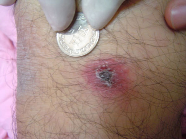 47岁陈先生是另一案例,他发烧、畏寒已1周并伴随有关节疼痛情形,诊所就诊多次无改善转至医院治疗。病史询问得知10天前曾至澎湖旅游,身体检查在右侧小腿发现0.5公分左右焦痂。实验室检查显示白血球增加合并肝指数异常,胸部X光显示双侧肺部浸润,后续疾管局报告诊断为恙虫病。