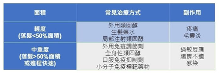 王羽安指出,若影响的头皮面积超过50%或进程极快,会选择口服或静脉注射的免疫抑制剂,通常会需要定期抽血监测副作用。外用治疗包含类固醇、生发药水、免疫调节剂等,也都被证实有不同程度的疗效。