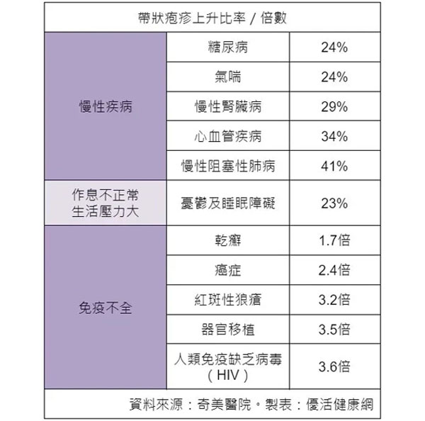 针对慢性疾病、作息不正常压力大及免疫不全者等3类人,李茂庭也提供下列1表对照,看懂罹患带状疱疹的上升比率及倍数: