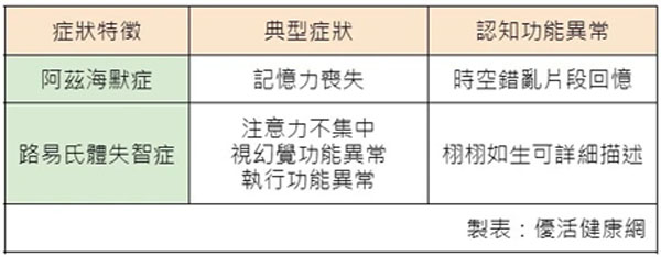 赵昌宏解释,阿兹海默症的典型症状是记忆力丧失,帕金森氏症的典型症状是双手颤抖、表情僵化、走路越来越慢步伐越来越小;路易氏体失智症者早期的记忆力丧失程度,则不像阿兹海默症这么严重,虽然随著病程仍有记忆力丧失的情形,但路易氏体失智症典型认知退化病徵为注意力不集中、视觉空间功能异常、执行功能异常等。