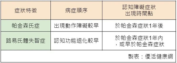在诊断上,路易氏体失智症和帕金森氏症和最大的差异,在于临床症状出现的时间不同,以1年来区分:若认知障碍出现于帕金森症状1年以后,则属帕金森氏症;如果认知障碍出现于帕金森症状1年内,或认知障碍出现早于帕金森症状,则为路易氏体失智症。