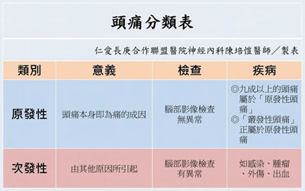 头痛的原因有很多,包括疲劳、睡眠不足、压力、药物都有关,频繁的头痛会影响人际关系及工作。仁爱长庚合作联盟医院神经内科医师陈培恺指出,头痛一般分为原发性与次发性头痛,以下为两者的差别: