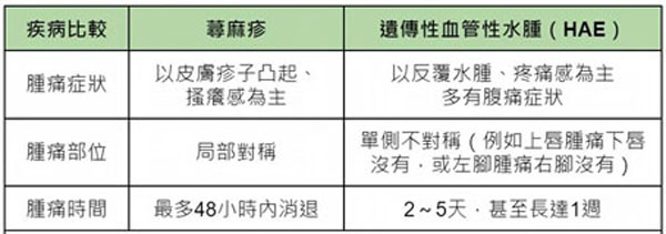 徐世达强调,不是所有的肿胀,都是过敏反应。究竟HAE患者在急性发病期,到底该如何与蕁麻疹分辨?他指出,HAE的3大症状特点为“慢慢肿慢慢退、单侧不对称、不会痒。”两者症状特徵比较如下表: