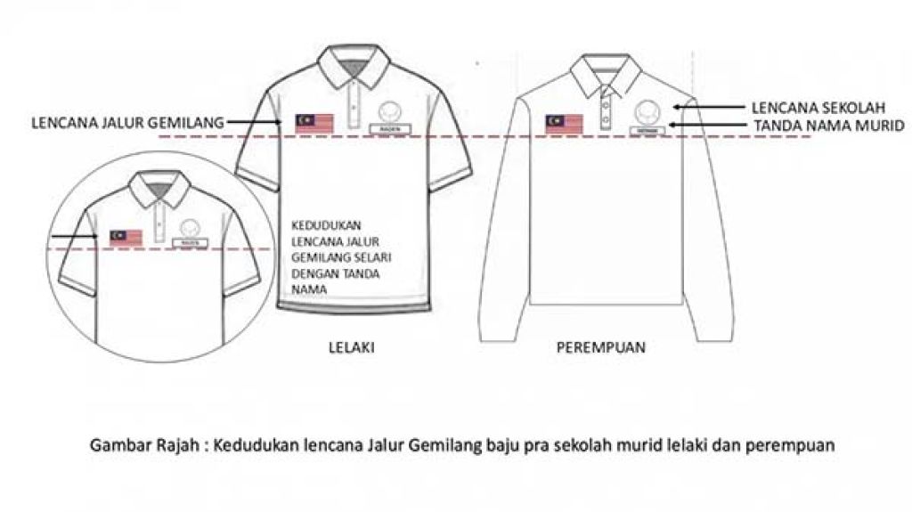 国旗徽章必须佩戴在学前校服(baju prasekolah)、学校T恤、女生马来校服(Baju Kurung)、女生蓝裙校服(pinafore tunic)、马来女生头巾(tudung)、运动服、峇迪衣服、制服团体的制服、特殊制服,以及技职教育企业衬衫。