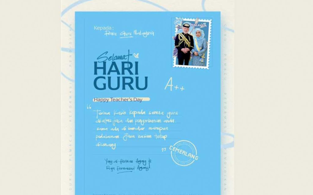 国家元首伉俪贺全国教育工作者教师节快乐 16 05, 2025 登载于 大马首题 (吉隆坡16日讯)国家元首苏丹依布拉欣陛下和元首后拉惹查丽苏菲雅感谢老师们的服务与牺牲,并祝贺全国教育工作者教师节快乐! 陛下今日在面子书贴文说,老师是伟大的,因为他们不求回报地传授知识,只为创造一个优秀社会。 “没有老师就没有知识,没有知识的前路一片黑暗;而老师是光,照亮我们走向光明未来。 陛下感谢所有教师的服务和牺牲,无论在城市还是乡村,教师将被永远铭记。 更多相关: « 首相:保护主义违背自由贸易 凸显强权与傲慢威胁全球 法丽娜:联邦与砂携手 落实大马协议教育条款 »