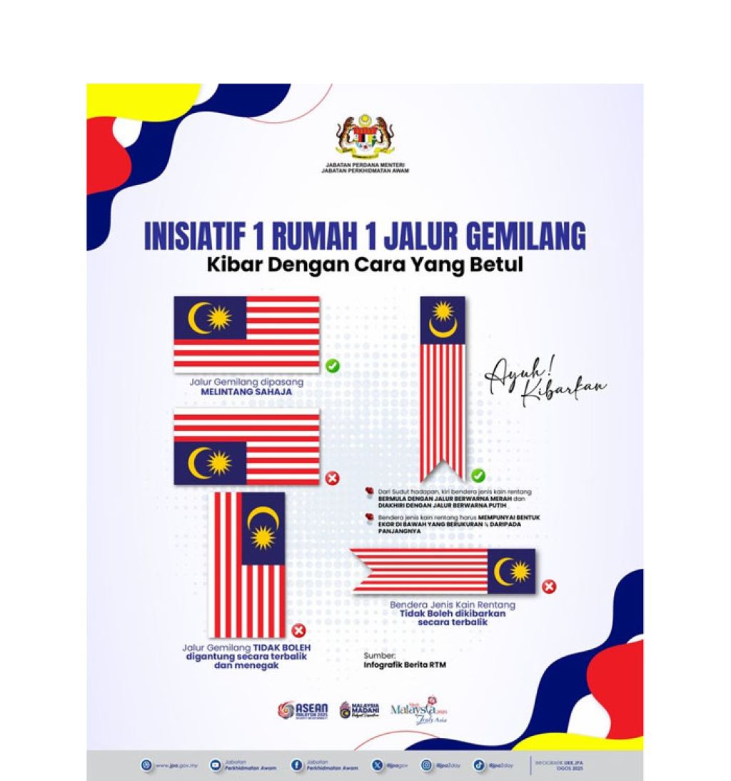 (吉隆坡11日讯)大马新闻局发布张挂国旗指南,鼓励民众配合国庆日到来,正确的悬挂“辉煌条纹”,以展现爱国情操。