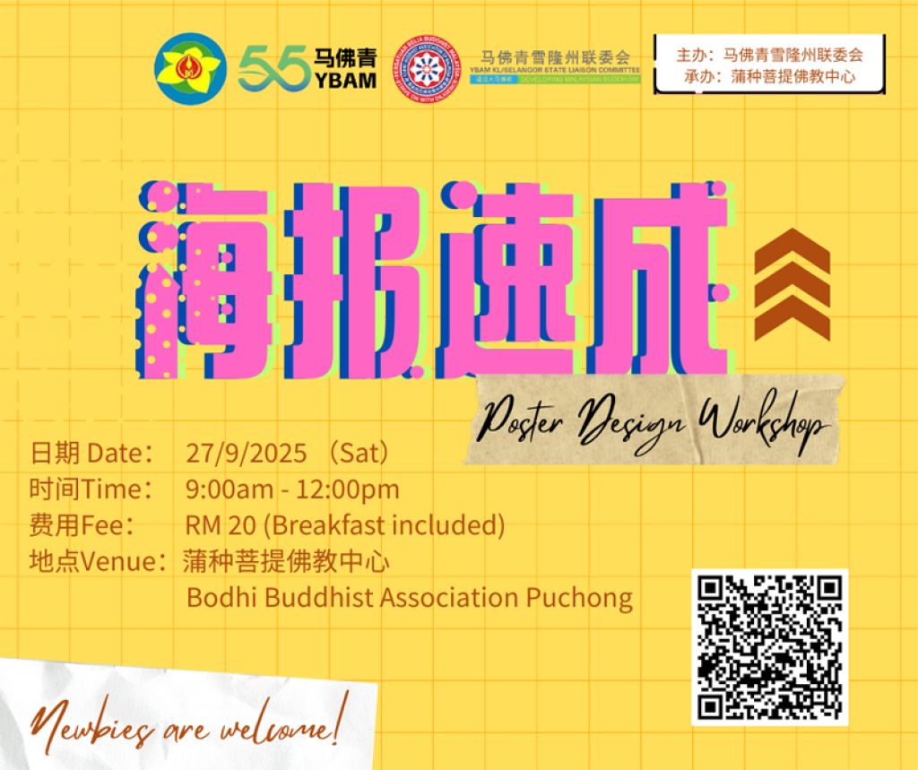 海报速成 工作坊 04 09, 2025 登载于 大马 (吉隆坡4日讯)你是否想让自己的设计 更专业、更吸睛? 想为佛教活动制作有美感又有力量的海报? 那就别错过这场《海报速成》工作坊。 轻松上手 , 实用技巧 ,有趣互动,即使是设计新手也能快速掌握重点 。 日期:27/9/2025(星期六 ) 时间 :9:00am - 12:00pm 地点:蒲种菩提佛教中心 费用:RM20(含早餐) 语言 :中文 无论你是想提升自我,还是为佛教出一份力, 这将是你不可错过的实践机会! 报名链接/QR码请见海报 名额有限,先到先得! 更多相关: « 13岁少女坠楼亡 法医不认为53公斤的物体进入洗衣机后能启动 张庆信:大马探索拓展在瑞士旅游市场的机会 »