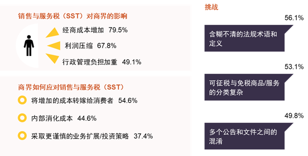 此SST实施后的调查显示,79.5%的受访者表示经商成本增加,67.8%的受访者表示利润空间遭受压缩,49.1%的受访者面临更重的行政管理负担。其中主要的影响包括对租赁费用和建筑合约征收的新服务税。许多企业和行业协会对扩大销售和服务税(SST)实施的时机不当和通知时间过于仓促、合规和营运成本增加、对消费者需求的潜在影响、法规不明确以及准备时间不足表示担忧。