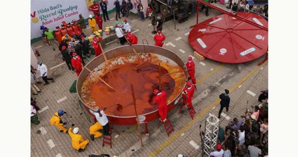 英国广播公司(BBC)报道,这道在西非广受欢迎的料理前后花了9小时才完成。称重时,工作人员用起重机把巨型铁锅吊起,但锅体一度断裂,挑战险些失败,所幸米饭没有洒落。健力士世界纪录随后在社交媒体上确认了这一成绩。