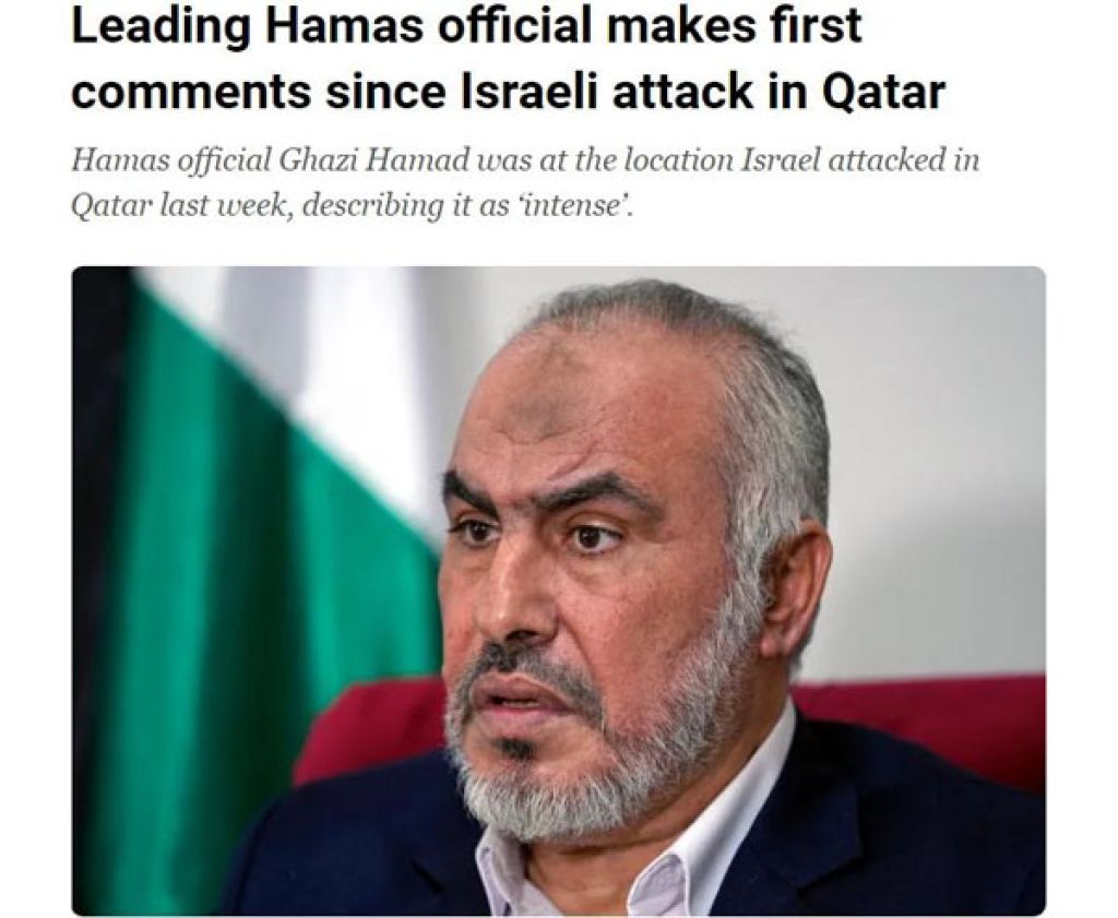 (综合19日电)据法新社及卡塔尔半岛电视台报道,当地时间9月17日,哈马斯高级官员加齐·哈马德接受卡塔尔半岛电视台连线采访,这是以色列9月9日袭击卡塔尔首都多哈以来,他首次公开露面。