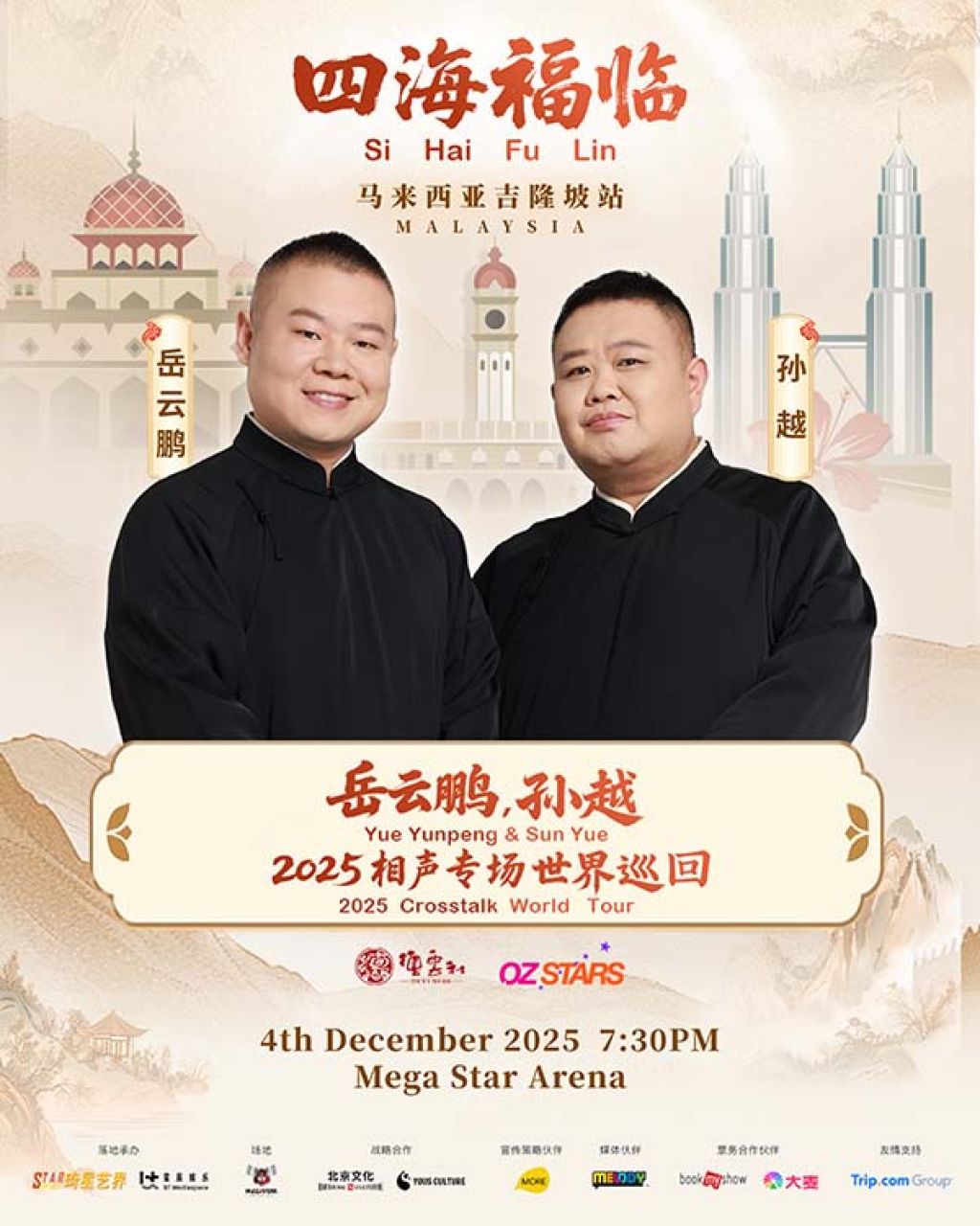 岳云鹏、孙越《四海福临2025相声专场》世界巡演—吉隆坡站,将于12月4日(星期四),晚上7时30分在Mega Star Arena举办。票价分为RM1088(VIP)、RM988(CAT 1)、RM688(CAT 2)、RM458(CAT 3)及RM358(CAT 4),门票将于9月30日(星期二)中午12时,正式通过 my.bookmyshow.com 和大麦票务全面开售,欲知更多详情,请浏览 YOUS CULTURE 寓思文化 的官方消息。