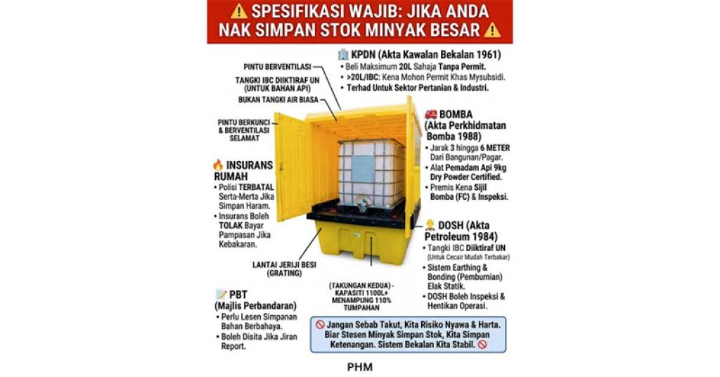 (吉隆坡25日讯)如果真想储存足够的石油应对危机,唯一较为实际的方法是保存在1000公升的集装桶(IBC),但要在住宅区存放大油罐并不简单,要遵守各项规定和要求,复杂、麻烦且成本高。