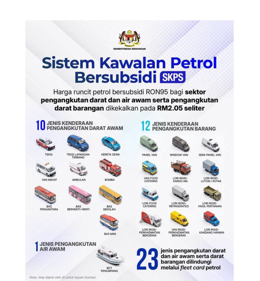 财政部发文指出,政府也继续通过汽油补贴控制系统(SKPS)和补贴柴油管制系统计划(SKDS),为公共陆路及水上交通,以及特定货物运输提供燃油补贴。