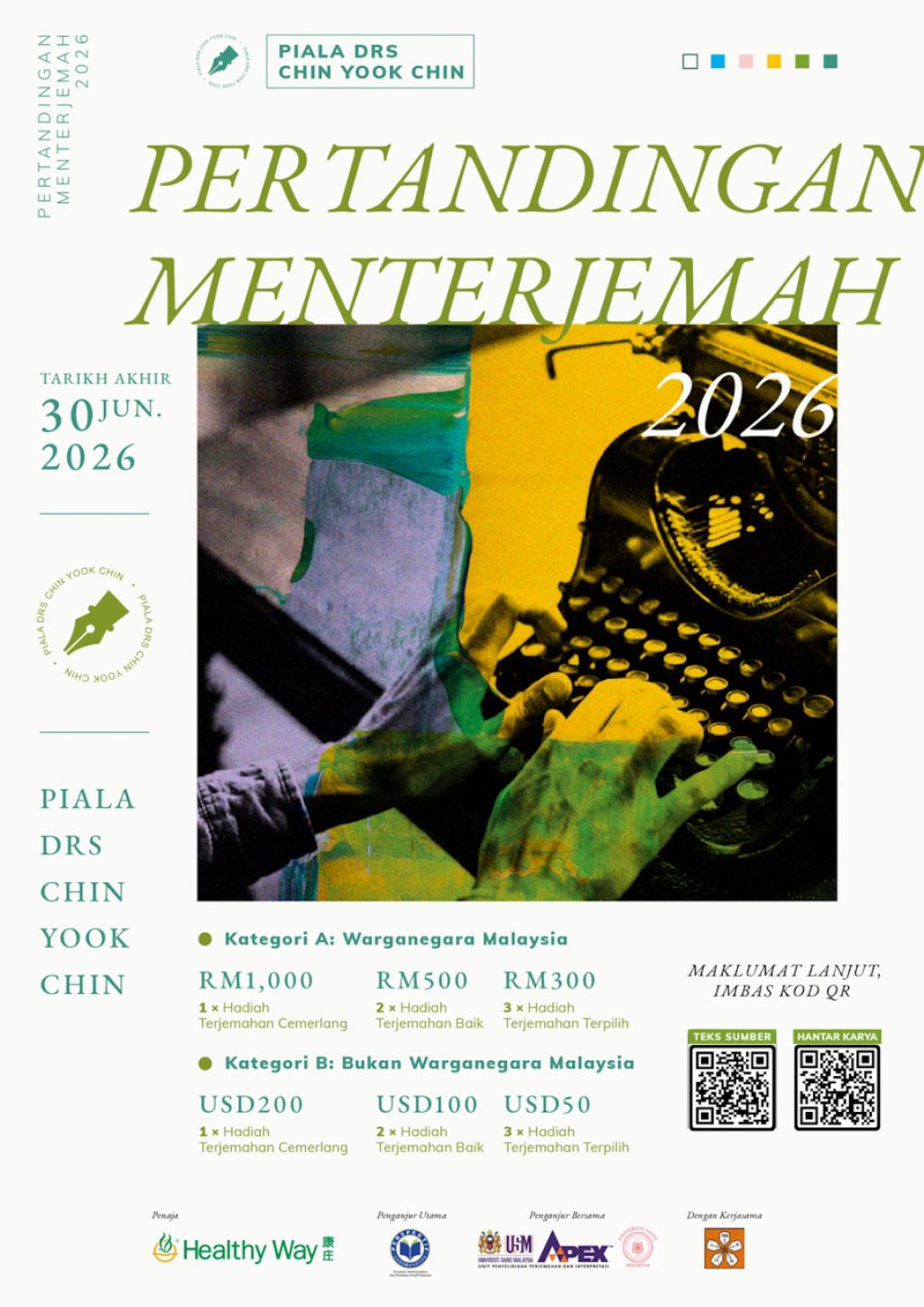 这项比赛获得康庄(马)有限公司兼该会名誉会长何加利赞助。有兴趣参与“第四届陈育青翻译奖”可到译创会面子书专页(Perspektif)查询详情,并在2026年6月30日前于https://forms.gle/LSkskBF8Aw3tBjsN6 提交译作。