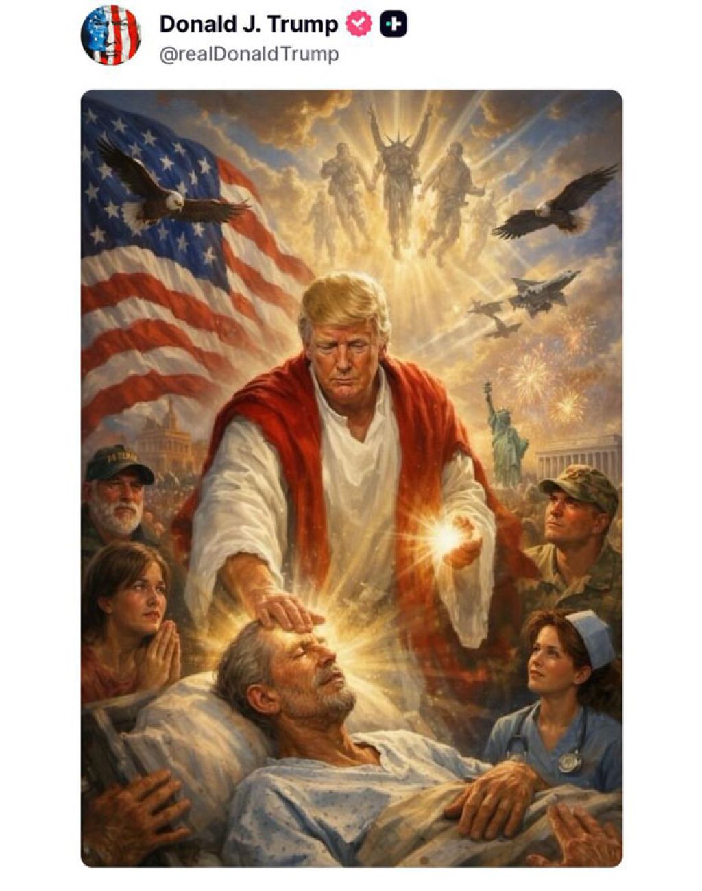 这张图片於12日深夜曝光,画面中特朗普身穿红白长袍、手部散发光芒,触碰一名病患额头,周围则有医护人员、士兵与祈祷民众环绕,背景还出现美国国旗等元素。整体构图被外界认为高度类似宗教画作耶稣治病,引发大批网友与宗教人士质疑,认为涉及亵渎。