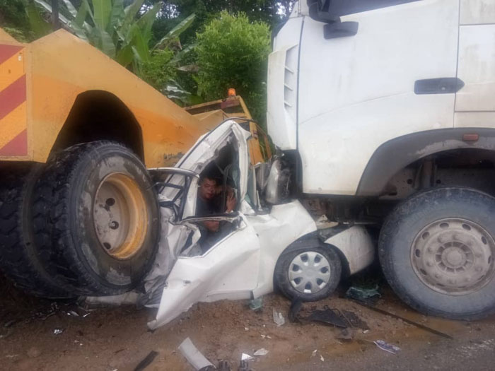 (古晋4日讯)斯里阿曼、木中省路段,靠近瑟拉邦马立,周二下午发生严重车祸,两辆罗厘相撞,将轿车夹撞在中间,酿3死3重伤悲剧。