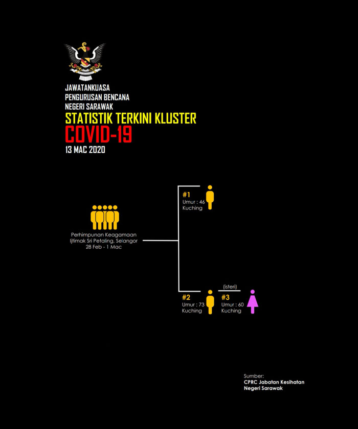 砂拉越救灾委员会主席拿督阿玛道格拉斯今午发文告指出,其中2名确诊者是在2月28日至3月1日在吉隆坡出席大城堡清真寺万人宗教活动,另1名是他们的家人。