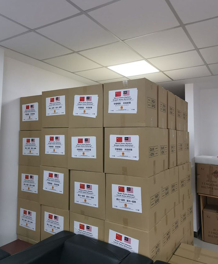 在这批运抵的抗疫物资的箱子外,除了贴上马中国旗,还用中文和马来文写上:遇山一起爬,遇沟一起跨以及Bukit sama didaki, lurah sama dituruni。