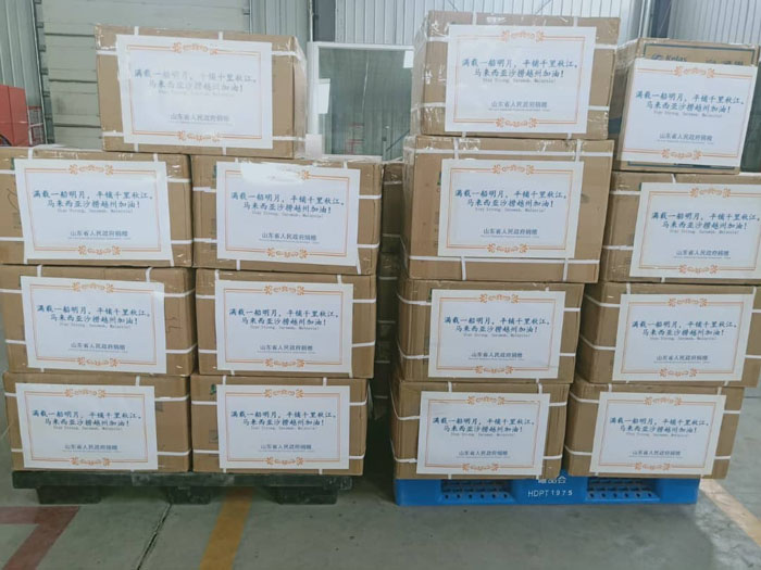 山东省在援助物资外箱贴上了“满载一船明月,平铺千里秋江”的标语,为马来西亚砂拉越州加油,展现了山东省政府和山东人民对友好省州砂拉越的美好祝福和满满情谊。