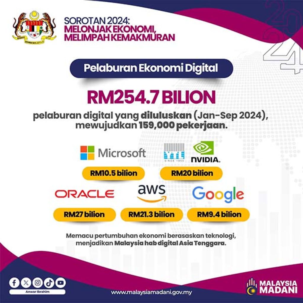 他形容这些投资将推动技术为导向的经济成长,将大马定位为东南亚的数码枢纽。