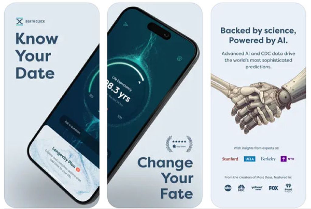 商业今日报导,这款死亡时钟App下载量已超过12.5万次,以1200项预期寿命研究中的5300万名受试者数据为基础,利用AI进行分析,范围涵盖饮食、运动、睡眠、压力等,并进行寿命预测。这款App旨在提供比传统方法更加精准的预测,会生成一张死亡日卡片,以及显示使用者剩余寿命的倒数计时器。