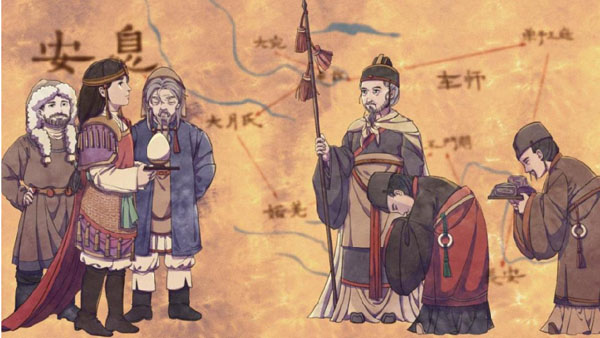 30 个故事,每一个都是自成一体的文化交流景观与传奇,但循序深入也传递文化交流发展阶段的轨迹。比如,“张骞通西域”“苏武牧羊在漠北”“经营丝路第一人——汉宣帝”“班超出使西域”这四个故事,为我们展现了汉朝中外交流滥觞期的时代坐标,递进地镌刻汉代丝绸之路开凿、奠基、初创的千古功业,呈现了故事主人公在中外交流中的责任使命与英雄传奇,更完美地诠释了政治局势与外交 、 经贸文化交流的互动关系及其转化。