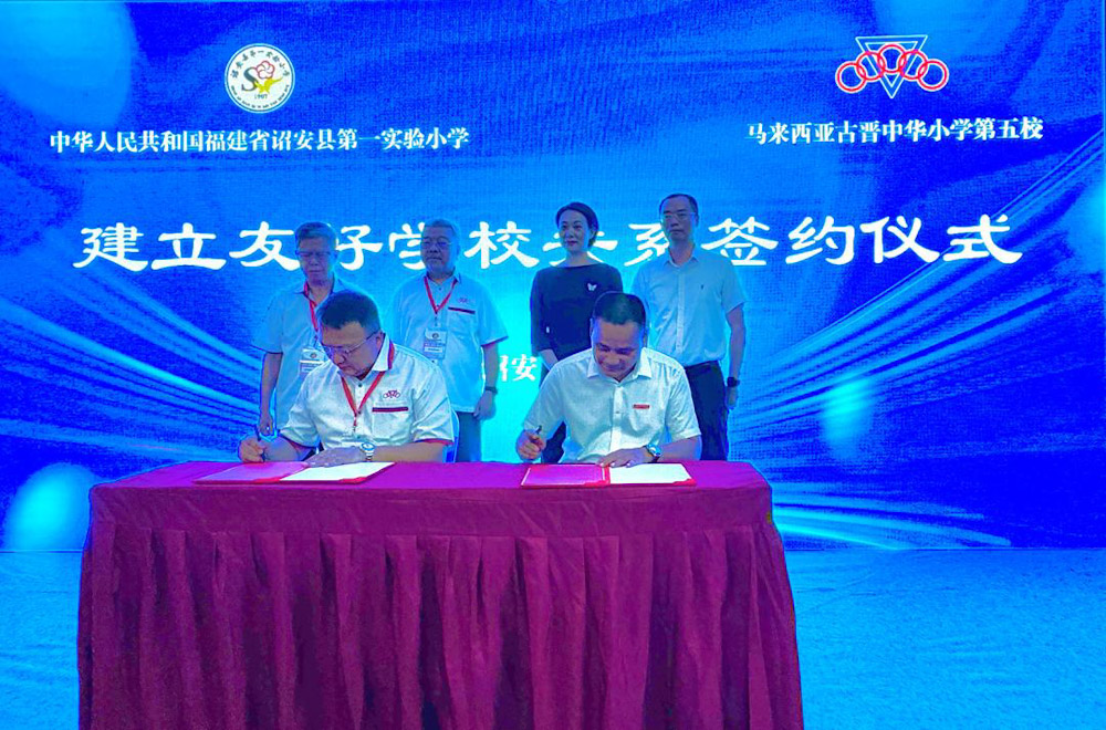 接着举行签约仪式,由诏安第一实验小学校长钟喜平与古晋中华小学校董会主席拿督蔡文铎代表签下友好学校协仪,并由许秀彬部长、拿督陈日枝与许庆喜见证。