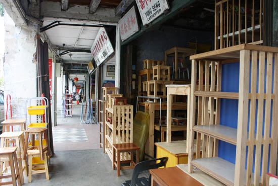 亚答街的英文名称为CarpenterStreet,其实并没有多少间的木匠或家私店,倒是隔邻的友海街上,家私店成行成市,而且这些规模大小不一的家私店门口,大都还挂着一面写着“上海XXX木工店”的宝号。