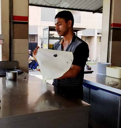 通常印度飞饼师傅会现场表演制作,从一粒面团逐渐甩成薄如纸片的面皮,先转右手再转左手,保持着划圆形的动作使飞饼不会黏叠,之后放平底锅上煎成金黄色。