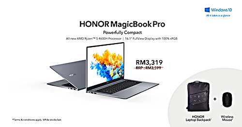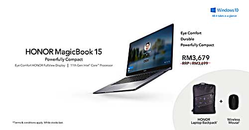 笔记本电脑方面,购买HONOR MagicBook Pro将可享有280令吉的超值优惠,而购买HONOR MagicBook 15则可享有20令吉的折扣。购买这两款笔电者,皆获赠笔电背包与无线蓝牙滑鼠。