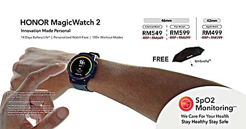 HONOR MagicWatch 2 42mm Agate Black玛瑙黑、46mm Charcoal Black碳石黑与46mm Flax Brown亚麻棕三种颜色的手表,皆可享有100令吉的折扣,并赠送雨伞给购买者。