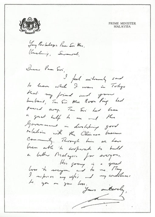 当我在东京听到尊夫君,也是我的好朋友丹斯里黄文彬逝世的消息,我感到十分的悲痛,丹斯里黄在协助政府建立与华人商界的良好关系上,给予我很大的帮助,通过和他携手合作,我们可以为每个人建立一个更好的马来西亚。