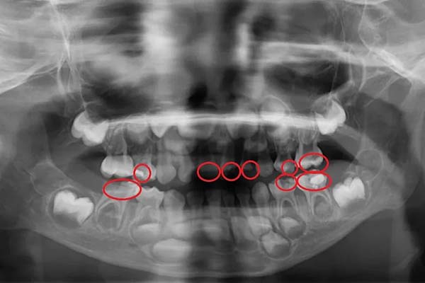 (图片 26cs05b)●X光看见孩子多颗蛀牙(红圈处均是蛀牙处)。
