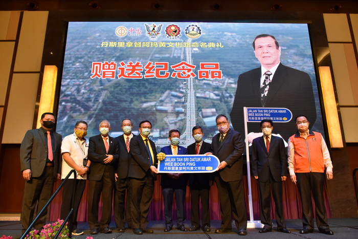 拿督斯里沈桂贤见证下,巴达旺市议会主席罗克强(左五)赠送丹斯里拿督阿玛黄文彬模拟路牌予家属代表拿督黄国辉(右三)。
