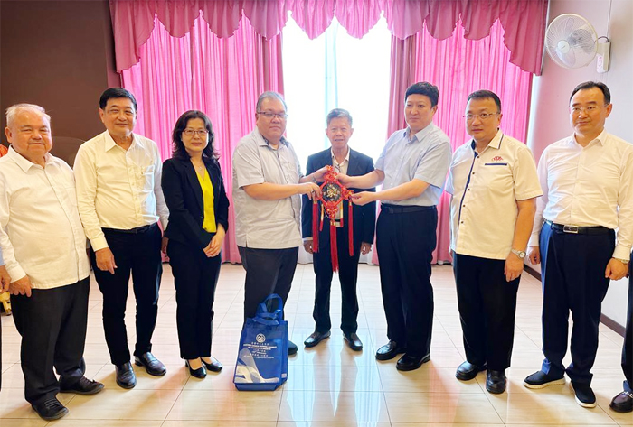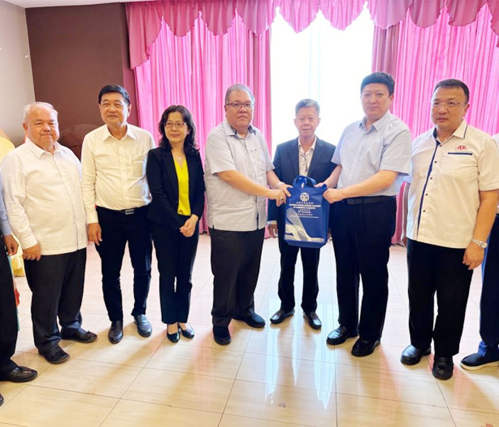 古晋中总会长拿督陈日枝(右三)见证下,古晋中总署理会长拿督黄国辉(左四)赠送纪念品予临沂市委常委、副市长隽新阳(右二),右一为古晋中总秘书长拿督蔡文铎。左一起为古晋中总副会长范庆和、副会长陈晋宗、临沂市人民政府外事办公室副主任阎智平。