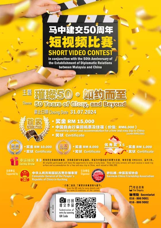 -马中建交 50 周年短视频比赛由砂中友好协会主办,支持单位为中华人民共和国驻古晋总领事馆。