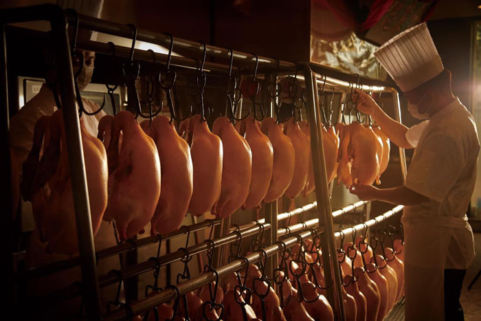 烤炉内,果木噼啪作响,一只只枣红色的烤鸭在师傅的长杆下缓缓转动,散发出诱人的香气。在全聚德,这炉火已经跨越了三个世纪,见证了自晚清、民国到社会主义新中国三个不同时代的历史变迁,传承了中国食鸭文化的精髓。