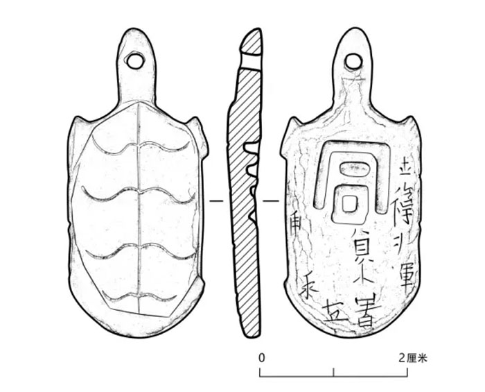 1981年,这枚铜龟符在焉耆回族自治县博格达沁古城被发现。龟背上刻着纹路,头部留有小孔,腹部还环绕刻着一圈铭文:“右玉钤卫将军员外置阿史那伽利支”,中间嵌着一个“同”字。经学者考证,这位将军正是唐朝西域名将阿史那忠。