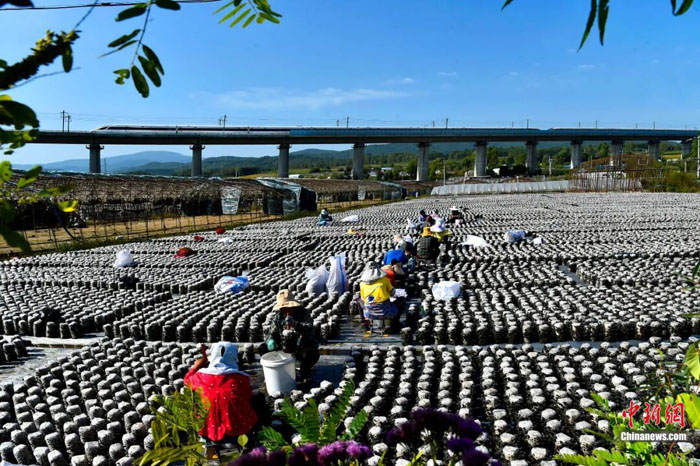 菌棚连绵,秋耳飘香,菌农们正忙碌地采摘最后一批秋耳,小镇上的食用菌大市场里,客商云集,打包、装车、发货……