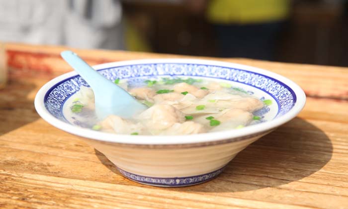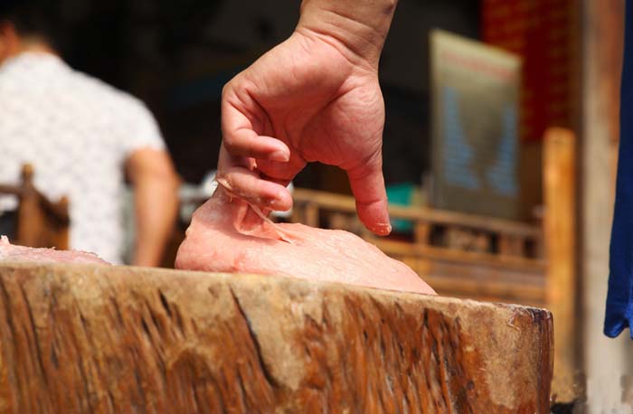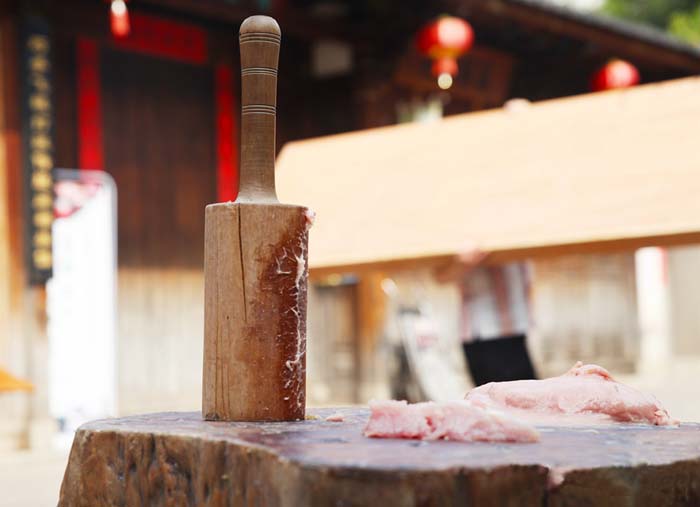 原来,肉燕皮是由精肉制成,上好的肉燕皮要选用现宰的猪后腿精肉,先剔净筋膜、碎骨等,将精肉块软硬搭配分组放置在砧板上,用木棰反复捶打,捶打时用力要均匀有节奏,肉块要反复翻转,边捶打边挑除细小筋膜,直至肉块打成胶状肉泥。再混以地瓜粉,擀制成一张又大又薄的皮,而后再分割为无数小张肉燕皮。