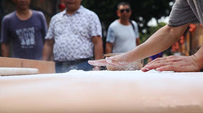 肉燕好吃,却不易做。“在冬天时,地瓜粉洒在身上和汗水混合在一起,异常寒冷;在夏天时,在高温下不断敲打肉泥,会让身体由于大量流汗而虚脱。”陈君凡说,在肉燕制作的每个环节、每个不同的时间段,都有不同的挑战。